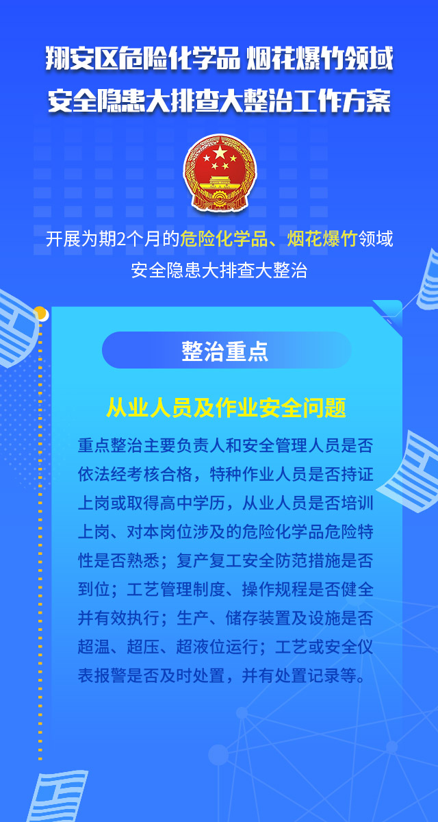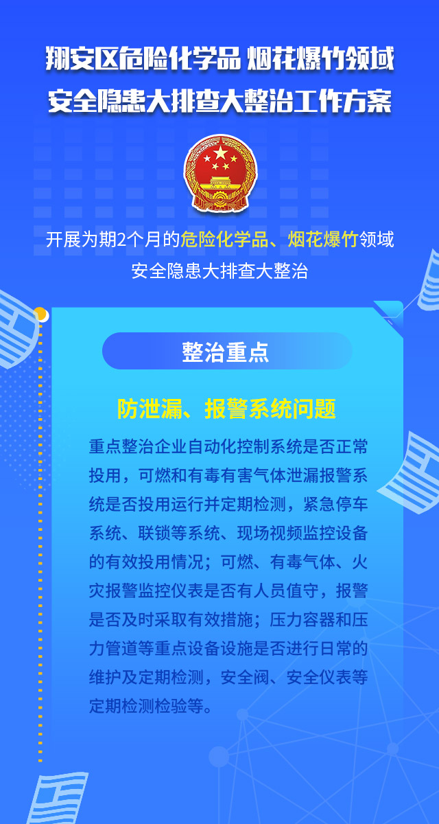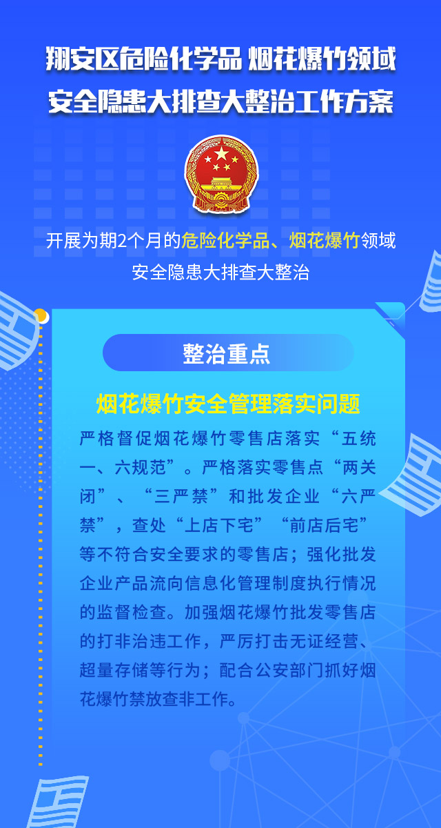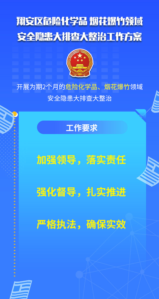 翔安区危险化学品 烟花爆竹领域安全隐患大排查大整治工作方案为深入贯彻习近平总书记关于安全生产工作的一系列重要指示批示精神,深刻吸取泉州市欣佳酒店“3·7”坍塌事故教训,根据3月9日国务院安委办和应急管理部视频会议、省市县三级视频会议精神以及《翔安区安全隐患大排查大整治工作方案》要求,经研究,决定从3月16日起在全区开展为期2个月的危险化学品、烟花爆竹领域安全隐患大排查大整治。现制定工作方案如下图片所示,请认真看哦~