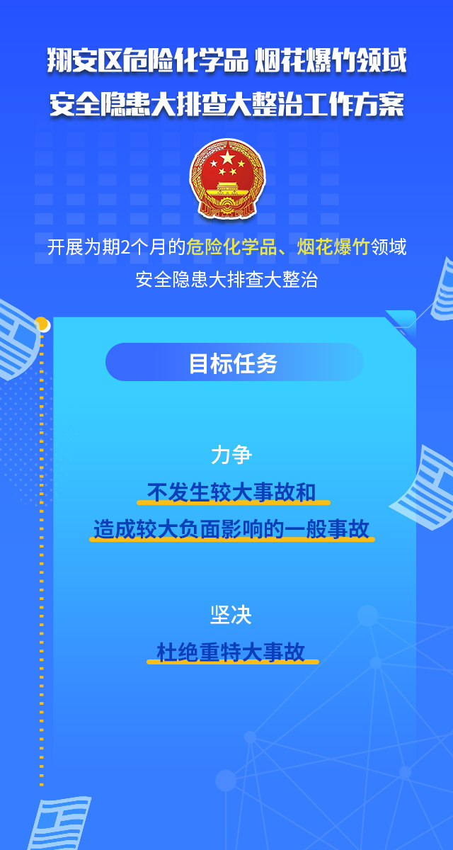 为深入贯彻习近平总书记关于安全生产工作的一系列重要指示批示精神,深刻吸取泉州市欣佳酒店“3·7”坍塌事故教训,根据3月9日国务院安委办和应急管理部视频会议、省市县三级视频会议精神以及《翔安区安全隐患大排查大整治工作方案》要求,经研究,决定从3月16日起在全区开展为期2个月的危险化学品、烟花爆竹领域安全隐患大排查大整治。现制定工作方案如下图片所示,请认真看哦~