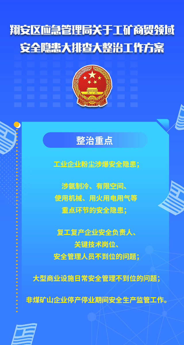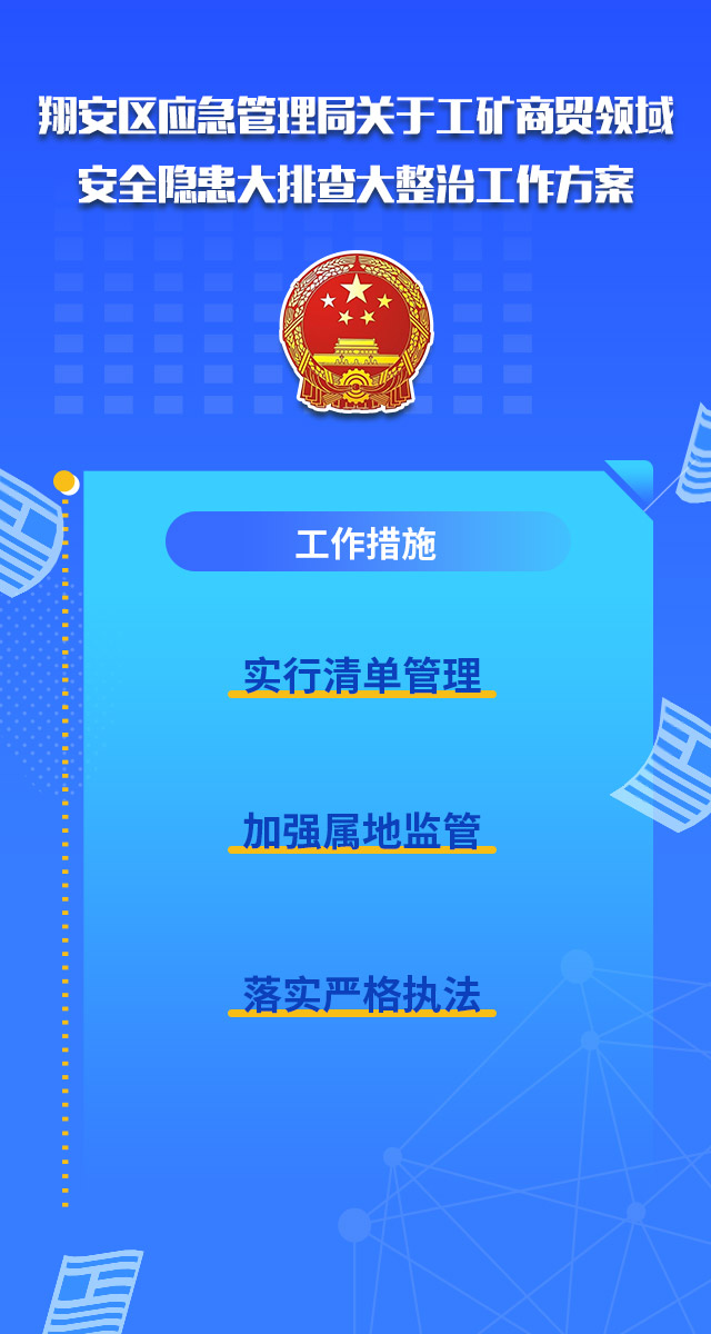 翔安区应急管理局关于工矿商贸领域安全隐患大排查大整治工作方案为深入贯彻习近平总书记关于安全生产工作的一系列重要指示批示精神,根据3月9日国务院安委办和应急管理部视频会议、省市县三级视频会议精神以及中共厦门市委办公厅、厦门市人民政府办公厅印发的《厦门市安全生产隐患大排查大整治工作方案》、翔安区人民政府办印发的《翔安区安全隐患大排查大整治工作方案》要求,经研究决定,制定以下实施方案。大家一起好好阅读下吧~